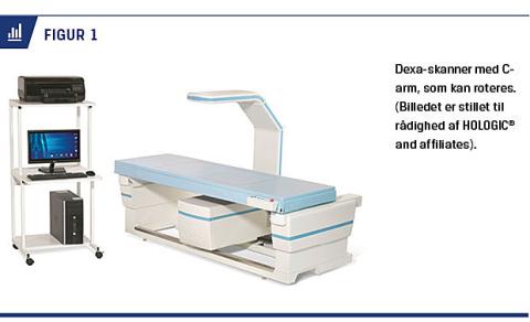 En vertebral fraktur defineres som et vertebralt højdetab på 20% eller derover udmålt ved billeddiagnostik af columna [10]. VFA er en radiografisk metode til lateral og anterior-posterior billeddannelse af columna fra Th4 til L4, og den anvendes til diagnosticering af vertebrale frakturer. Skanningen kan udføres på en konventionel dexa-skanner, ved at man roterer den såkaldte C-arm, mens patienten fortsat er placeret i rygleje (Figur 1). Patienten kan således få foretaget rutine-dexa-skanning og blive undersøgt for vertebral fraktur i samme undersøgelse. I Danmark er der i øjeblikket ingen DRG-takst for at udføre VFA, og prisen for undersøgelsen er i USA på 20-30 USD (150-180 kr.) [11]. VFA udsætter patienten for en lav stråledosis (3 µ-sievert) – svarende til én dags baggrundsstråling i Danmark [7].