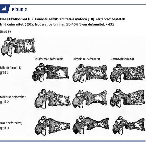 Blandt personer over 50 år er forekomsten af osteoporose 40% hos kvinder og 18% hos mænd [1]. Omkring 20.000 frakturer årligt tilskrives helt eller delvist osteoporose, og kun en femtedel af patienterne med estimeret osteoporose bliver i dag diagnosticeret og tilbudt behandling [2]. Knogledensitometri udgør en hjørnesten i diagnostikken af osteoporose og udføres ved dual energy X-ray (dexa)-teknik med bestemmelse af T-scorer ved måling i columna lumbalis og den proksimale femur. Diagnosen osteoporose kan stilles, hvis T-scoren er mindre end –2,5. Imidlertid kan diagnosen også stilles, hvis der er lavenergifraktur i columna eller hofteregionen. Med lavenergi menes fald fra egen højde ved egen hastighed. Patienter med vertebrale frakturer er ofte initialt asymptomatiske og risikerer således, at frakturen bliver overset, hvis ikke der udføres billeddiagnostisk undersøgelse af columna. En vertebral fraktur øger risikoen for nye symptomatiske frakturer, ligesom mortaliteten øges [3], hvorfor det er yderst vigtigt at få diagnosticeret sådanne frakturer,