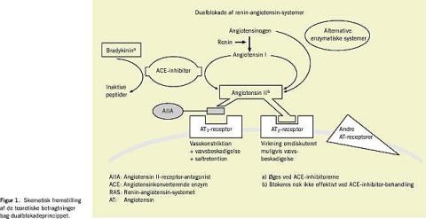 Hæmning af renin-angiotensin-systemet er en afgørende faktor i behandlingen af patienter med hjertesygdom, nyresygdom eller diabetes. Dualblokadeprincippet, hvor man anvender kombinationen af en angiotensinkonverterende enzym (ACE)-inhibitor og en angiotensin II-receptorantagonist, kan muligvis bidrage med den bredeste og mest effektive blokade af renin-angiotensin-systemet. Der foreligger i dag adskillige studier, hvis resultater indikerer, at dualblokadebehandling har effektiv virkning. Størstedelen af de tilgængelige studier er dog små, og vi har kun to studier, hvor man har fundet virkning på mortalitet eller langtidseffekt. Der er foretaget en MEDLINE-søgning med søgeordene: receptors, angiotensin/*antagonists & inhibitors, angiotensin-converting enzyme inhibitors, hypertension, diabetes, nephropati, heart failure, med begrænsning til engelsksprogede artikler, hvor de to præparater er brugt i kombination. På basis af de fremkomne artikler er herværende referencer udvalgt med eksklusion af studier, som kvalitetsmæssigt er vurderet at være for ringe eller at dække emner, som er bedre dokumenteret andetsteds. I denne oversigtsartikel giver vi et overblik over de resultater, som foreligger med dualblokadebehandling af patienter med hypertension, diabetes, nefropati og hjerteinsufficiens.