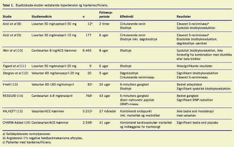 Der fo religger yderligere en del små studier med ganske kort followuptid og ganske diskrete resultater [11, 12]. Overordnet set har dualblokade ikke vist sig at være overbevisende hos patienter med essentiel hypertension. I Tabel 1 gives der en oversigt over de nævnte studier.