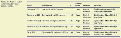 Der er efterhånden flere studier med dualblokadebehandling til diabetespatienter med hypertension og/eller nefropati. Der er dog ingen studier med længere followuptid end 12 uger. Det første studie var af Hebert et al med en lille serie på kun syv patienter med diabetes, hypertension og makroalbuminuri. Her fandtes det arterielle blodtryk at være signifikant sænket, når man adderede 50 mg losartan til den eksisterende ACE-hæmmer-behandling. Der fandtes dog ingen ændring i proteinurien, muligvis betinget af en meget kort followupperiode og en lille population [17]. Dette fandtes i et andet korttidsstudie med diabetespatienter med nefropati. Patienterne var her type 2-diabetikere med hypertension og proteinuri (> 1 g/dag). Her fandt man en signifikant virkning på både blodtryk og albuminuri ved at lægge 8 mg candesartan oven i behandlingen med anbefalede doser af langtidsvirkende ACE-inhibitorer [18]. Dette genfandtes i et andet studie fra samme gruppe, hvor man anvendte AIIA'en irbesartan i kombination med en ACE-hæmmer hos patienter med type 1-diabetes, svær nefropati og hypertension [19]. Her fandtes igen signifikant reduktion af både albuminuri og blodtryk, når patienterne var i dualblokadebehandling. Resultaterne af to lignende studier understøtter disse resultater, hvor patienterne endda er optitreret i ACE-hæmmer ved studiestarten [20].