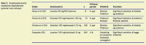 Sammenfattende må man sige, at der findes en del studier om dualblokade hos patienter med nefropati. Resultaterne af disse studier peger alle i retning af en særdeles lovende virkning af dette behandlingsprincip på denne patientgruppe. I Tabel 3 gives der et overblik over en del af de nævnte studier.