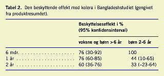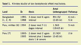 Den kliniske effekt mod kolera er undersøgt i tre randomiserede og placebokontrollerede kliniske undersøgelser gennemført i Bangladesh [1-5] (endemisk område) og Peru [6, 7] (ikkeendemisk område) (Tabel 1 ). I Bangladeshstudiet blev der fundet en samlet beskyttelseseffekt efter tre vaccinedoser på 85% efter seks måneder og på 50% efter tre år. Beskyttelsen var relateret til alder; således aftog beskyttelsen hos børn mellem 2 år og 6 år hurtigt efter de første seks måneders followup (Tabel 2 ).