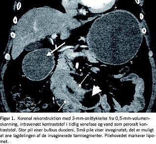 En tidligere rask, 60-årig mand med body mass index på 36 blev henvist efter fem måneders varende tiltagende symptomer på ventrikelretention i form af pyrosis, kvalme og opkastninger samt mavesmerter og et vægttab på 13 kg. Patienten havde haft en episode med blødning per rectum og anæmi (hæmoglobin: 5,2 mmol/l). Ved gastroskopi fandt man ventriklen svært forstørret, og der påvistes et ulcus i en svært deformeret bulbus duodeni uden blødning. Ulcus blev skleroseret og der blev iværksat Helicobacter pylori-eradikationsbehandling. Ved en kontrolgastroskopi fire uger senere fandt man udtalt ventrikelretention og et stenoseret parti i duodenums andet stykke, som ikke var passabelt for skopet. Kontrastpassage af ventrikel og duodenum viste, at duodenum var klemt af en rundagtig udfyldning. Ved computertomografi (CT) af abdomen sås et okkluderende, hypodenst vævsområde i 2.-3. stykke af duodenum, som var fri af pancreas (Figur 1). Det blev primært tolket som invagination som følge af et stort tarmvægslipom.