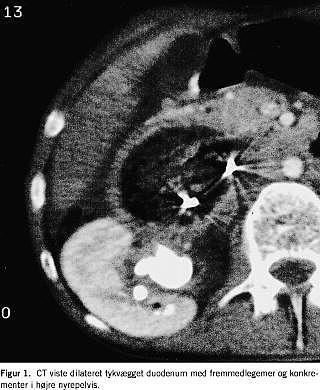 Fistler mellem nyrer/urinveje og duodenum er sjældne [4, 5], de skyldes hyppigst nyrepatologi [5]. Vi har set en sådan fistel forårsaget af duodenale fremmedlegemer, hvilket kun er beskrevet et par gange før [2]. Symptomer og fund i form af abdominalsmerter, almen svækkelse, vægttab, feber, pyuri og hæmaturi er fremtrædende ved duodenorenale fistler. Ofte har symptomerne stået på i måneder eller år, før den korrekte diagnose stilles [5]. Retrograd pyelografi er beskrevet som den bedste diagnostiske metode [5]. I dette tilfælde var CT af abdomen afgørende for diagnosen, og den synes at være velindiceret hos patienter med pica og ovennævnte symptomer, såfremt de sædvanlige initiale undersøgelser ikke afklarer diagnosen.