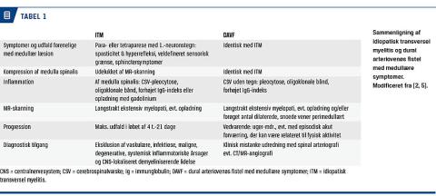 Sygehistorien illustrerer nødvendigheden af diagnostisk revurdering ved atypisk forløb eller usikkerhed om diagnostiske kriterier (Tabel 1). Hos patienten i sygehistorien vakte vedvarende normal spinalvæske og atypisk forløb mistanke om DAVF. Ved idiopatisk TM er forløbet monofasisk med progression over fire timer til 21 dage med relativt lav recidivrate, og patientpopulationen er typisk yngre end patienter med DAVF.