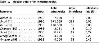 Infektionshyppigheden efter artroskopi rapporteres i litteraturen at variere mellem 0,03% og 0,42% [4-10] (Tabel 1 ). Infektion er oftest forårsaget af grampositive stafylokokker [4, 11]. I eksperimentelle studier har man vist, at kondrolyse begynder inden for de første 24 timer efter infektionens opståen [12]. Purulent artrit medfører således en risiko for udvikling af artrose.