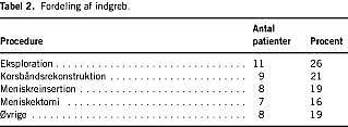 Procedurerne fordelte sig som anført i Tabel 2 . Hovedparten af indgrebene, 37 (86%), blev udført af en speciallæge i ortopædkirurgi. Indgrebene blev foretaget i universel anæstesi hos 26 (60%), i spinal anæstesi hos ti (23%), i lokal anæstesi hos fem (12%) og i epidural anæstesi hos to (5%). Kun to patienter fik ifølge journalen profylaktisk antibiotika; i begge tilfælde var der tale om patienter, der skulle have foretaget korsbåndsrekonstruktioner. Tidligere havde 19 (43%) patienter fået foretaget artroskopiske indgreb i samme knæ.