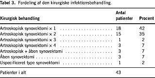Behandlingen af infektionen var hos alle 43 patienter længerevarende antibiotikabehandling og synovektomi, heraf blev 36 (84%) foretaget rent artroskopisk i en eller flere omgange. Tre artroskopiske synovektomier blev suppleret med åben synovektomi (Tabel 3 ). Toogtredive patiente r (74%) fik foretaget knæpunktur forud for synovektomien. Alle patienter fik antibiotisk behandling.