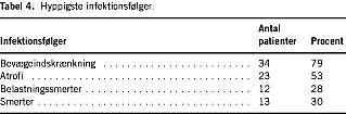 Hospitalsopholdet varede mellem fire dage og ni uger; gennemsnitlig indlæggelsestid var 20 dage (median tre uger). Den forlængede sygeperiode var gennemsnitlig 257 dage. Mermengraden var ved gennemgangen af journalerne vurderet hos 26 (60%) af patienterne, og var gennemsnitlig på 6%. Erhvervsevnetabet var opgjort hos 19 (44%), af disse blev 14 bedømt til ikke at have erhvervsevnetab. Mermengrad og erhvervsevnetab fastsættes af Patientforsikringens jurister og lægelige konsulenter på baggrund af patientskadeerklæringer eller speciallægeerklæringer samt Arbejdsskadestyrelsens menskadetabel. I Tabel 4 vises de hyppigste infektionsfølger vurderet af Patientforsikringens lægekonsulenter ud fra speciallægeerklæringer eller patientskadeerklæring fra egen læge. Fire patienter (9%) fik efterfølgende total knæalloplastik.