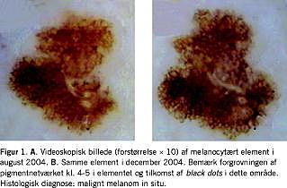 På højre skulder havde patienten et 4 × 5 mm stort melanocytært element (Figur 1 A ), der var dermoskopisk asymmetrisk i to på hinanden vinkelrette akser, abrupt ophør af pigmentnettet i en ottendedel af elementet, ensartet lysebrun farve, og af dermoskopiske differentialstrukturer fandt vi pigmentnet og en enkelt black dot (dermoskopisk punktformet struktur med en diameter under 0,1 mm). Ved redermoskopi 3-4 måneder senere havde elementet ændret sig. Nedadtil kunne nu ses en atypisk fortykkelse af pigmentnettet, og her havde det ikke længere en regelmæssig bikubestruktur. Der var tilkommet yderligere nogle black dots .