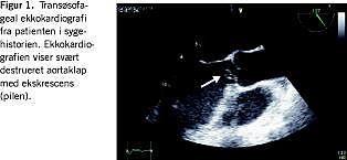 En 60-årig mand, der havde reumatoid artritis og pacemaker, blev indlagt med almen sygdomsfornemmelse gennem flere uger. Patienten var forinden af egen læge sat i behandling med penicillin på mistanke om pneumoni, og han var ved indlæggelsen konfus, rodende og højfebril med en temperatur på 38,6 grader, hypotensiv (blodtryk 90/38 mmHg) og takykard (puls 175/min). Der blev initialt taget et enkelt sæt (en aerob plus en anaerob kolbe) til bloddyrkning før påbegyndelse af antibiotisk behandling med penicillin, gentamicin og metronidazol. Pga. de cerebrale symptomer blev patienten lumbalpunkteret. Lumbalpunkturen viste purulent meningitis med > 6.000 leukocytter, lav glukoseværdi og forhøjet proteinværdi i spinalvæsken. En røntgenundersøgelse af thorax viste højresidig pneumoni. Transtorakal ekkokardiografi (TTE) blev udført, da der var kardial mislyd og lungestase. Man fandt en normal systolisk pumpefunktion med oscillerende ekskrescenser på aortaklappen og svær aortainsufficiens. Ved supplerende transøsofageal ekkokardiografi bekræftede man TTE-fundene (Figur 1). Både bloddyrkning og spinalvæske var uden vækst af bakterier.