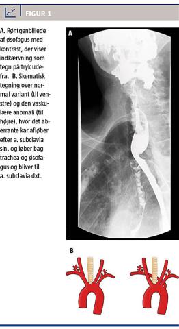 Ved en klinisk undersøgelse inkl. fleksibel laryngoskopi blev der fundet normale forhold. Pga. patientens anamnese var der indikation for endoskopisk udredning med øsofagoskopi og gastroskopi. Hun var pga. sine konkurrerende sygdomme utryg med det diagnostiske tilbud, hvorfor der i stedet blev foretaget en røntgenundersøgelse med kontrast af øsofagus. Her blev der fundet normalt kontrastnedløb til ventriklen, men på niveau med arcus aorta blev der fundet en indkærvning i kontrasten fra venstre side (Figur 1A). Efterfølgende CT af hals/thorax viste en vaskulær anomali med en abnorm afgående a. subclavia dxt., der komprimerede øsofagus, især pga. forkalkninger heri. Denne benigne tilstand, der muligvis kunne forklare patientens symptomer, beroligede hende, og hun ønskede ikke yderligere tiltag. I samråd med hende blev behandlingen en ændring til mere flydende kost og opfølgning via hendes egen læge.