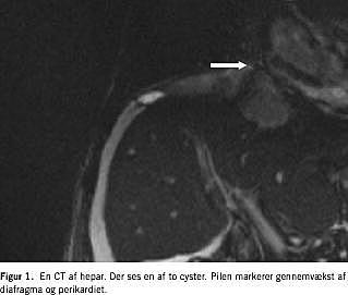 Ved en efterfølgende sektion blev det påvist, at den multilokulære ekinokokcyste havde penetreret diagfragma og perikardiet med indvækst i højre atrium.