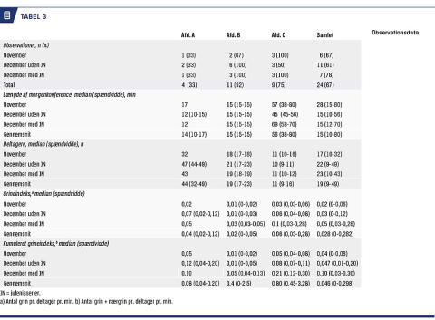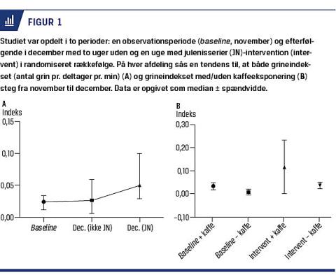 På de enkelte afdelinger tenderede grineindekset til at stige fra november til december (Tabel 3). Denne stigning fortsatte på to afdelinger efter JN-eksponering på to afdelinger. På den sidste afdeling var der i interventionsperioden blot en måling. Målingen lå under medianen fra de øvrige observationer (n = 2) i december. En afdeling havde en signifikant stigning i grineindekset i perioden. Samlet set sås en ikkesignifikant stigning i grineindekset fra baseline (0,02) til december (0,03) og yderligere efter JN (0,05) (Figur 1).