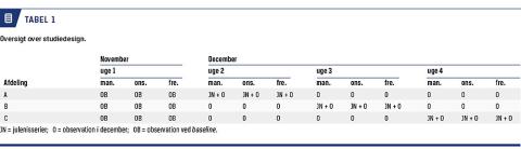 Studiet var opdelt i to perioder: en observationsperiode (baseline, november) og efterfølgende tre uger i december med to uger uden intervention og en uge med JN-intervention i randomiseret rækkefølge (Tabel 1). Observationerne blev foretaget mandag, onsdag og fredag. Der blev udpeget to observatører fra hver afdelings personale for at opretholde et blindet koncept blandt de øvrige læger. Observatørerne var udvalgt på baggrund af tidligere erfaring med observation af JN-effekten på DGH blandt børn i jyske husstande.