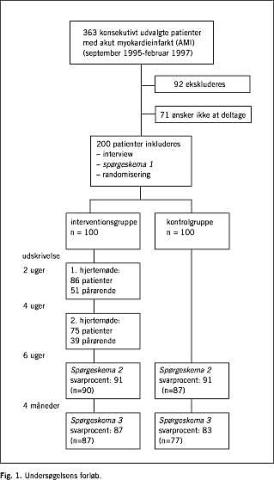 I perioden fra september 1995 til februar 1997 blev 363 patienter indlagt med AMI på Kardiologisk Afdeling, Amtssygehuset i Herlev. I alt 92 patienter kunne ikke inkluderes i undersøgelsen, idet 35 døde under indlæggelsen, 20 ikke mestrede dansk, 11 blev overflyttet, 9 havde korte indlæggelsesforløb, og 17 blev ekskluderet af andre årsager. Af de resterende 271 ønskede 71 ikke at deltage, hvilket efterlader 200 patienter i undersøgelsen (Fig. 1 ). De 71 patienter, som ikke ønskede at deltage, begrundede typisk fravalget med, at de ikke orkede det, eller at de ikke havde lyst til gruppemøder. Patienterne kunne kun inkluderes en gang. Sammenholdt med de inkluderede patienter, var der blandt de 163 patienter, som ikke blev inkluderet, en større andel af kvinder, pensionister og aleneboende samt en højere gennemsnitsalder. Desuden havde en større andel tidligere haft AMI, færre fik trombolyse, og færre fik målt uddrivningsfraktion.