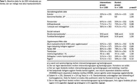 Der var under indlæggelsen ingen signifikante forskelle på interventionsgruppen og kontrolgruppen i relation til en lang række væsentlige parametre (Tabel 1 ), ligeledes var der ingen signifikante forskelle i ordineret medicin ved udskrivelsen. I interventionsgruppen døde en patient inden det første hjertemøde, mens yderligere 13 ikke mødte op, heraf otte aleneboende mænd. Af de 23 kvinder, der blev randomiseret til interventionsgruppen, mødte 21 op til begge hjertemøder (Fig. 1).
