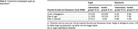 Alle tre spørgeskemaer indeholdt Hospital Anxiety and Depression Scale (HAD) [9], mini Mental Adjustment to Cancer (mini-MAC) [10] og spørgsmål om selvvurderet helbred og fysisk formåen. HAD [9], der er udviklet til registrering af angst og depression hos somatisk syge patienter, blev valgt grundet dets simple opbygning og validering blandt hjertepatienter. Patienternes mestringsevne blev vurderet ved mini-MAC [10], som er udviklet til patienter med cancer med det formål at registrere patienternes mestring af pludselig sygdom. Vi ændrede to spørgsmål, der gik specifikt på cancer, så de i stedet omhandlede hjertesygdom.