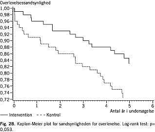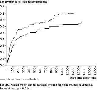 Ved followup var der ingen signifikante forskelle mellem interventionsgruppen og kontrolgruppen i forhold til mestringsstrategier, fysisk funktion og selvvurderet helbred. Der sås en tendens til lavere score for angst i interventionsgruppen end i kontrolgruppen efter seks uger, mens det var omvendt efter fire måneder (Tabel 2 ). Hvad angår depression sås en tendens til højere score i interventionsgruppen. Ingen af forskellene var signifikante. De patienter, som ikke besvarede spørgeskemaerne efter seks uger og fire måneder, havde ved studiets start en højere score for både angst og depression end de patienter, som besvarede alle skemaer. Hvis det forudsættes, at de personer, som ikke svarede efter seks uger og fire måneder, havde uændret angst- og depressionsscore, ville forskelle i interventionsgruppen og kontrolgruppen fortsat ikke være signifikante (data ej vist). I interventionsgruppen var der signifikant færre genindlæggelser end i kontrolgruppen (log-rank test: p = 0,014), og forskellen var tydelig allerede efter det første halve år (Fig. 2A ). Der var en tendens til lavere dødelighed i interventionsgruppen end i kontrolgruppen, hvilket først og fremmest skyldes en højere dødelighed i kontrolgruppen i de første måneder efter inklusion (Fig. 2B ).