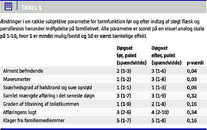 Af Tabel 1 fremgår det, at der var signifikante ændringer, hvad angår alment befindende og mavesmerter samt en stærk tendens til øget halsbrand efter SFPS-eksponeringen, mens der ikke var signifikant forskel for de andre parametre (samlet mængde afføring, grad af tilsvining af kummen, lugt og klager fra familiemedlemmer).