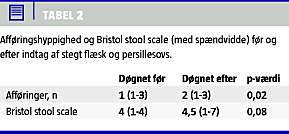 Til vurdering af ændringer i afføring anvendtes det validerede Bristol stool scale [3].