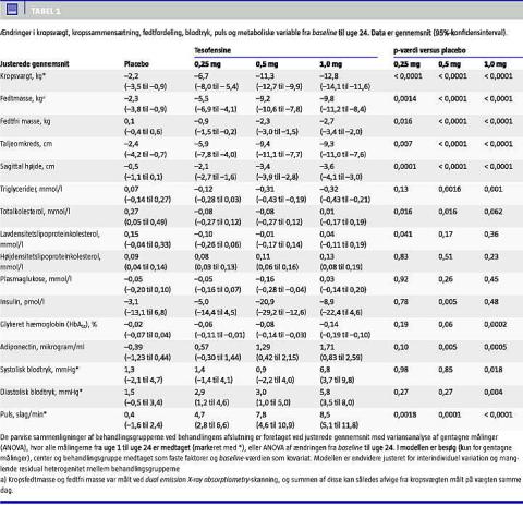 I alt 203 kvinder og mænd (henholdsvis 143 og 60) blev randomiseret til den dobbeltblindede behandling. Heraf gennemførte 79% de 24 ugers behandling med tesofensine eller placebo. Frafaldet var lavere blandt dem, som fik 0,5 mg tesofensin (12%) i forhold til 1,0 mg (29%), men for ingen af de tre tesofensinegrupper var frafaldet signifikant forskelligt fra placebogruppen (25%). Efter 24 ugers behandling oplevede de forsøgspersoner, som fik aktiv medicin, et signifikant større vægttab end dem, som fik placebo (p < 0,0001) (Tabel 1 ). Det gennemsnitlige, placebokorrigerede vægttab var på 4,5% for 0,25 mg (4,5 kg (standard error 0,87), p < 0,0001), 9,2% for 0,5 mg (9,1 kg (0,91), p < 0,0001) og 10,6% for 1,0 mg-gruppen (10,6 kg (0,84), p < 0,0001). Der var ingen signifikant forskel på vægttabet mellem dem, der blev behandlet med 0,5 mg, og dem, der blev behandlet med 1,0 mg tesofensine (Figur 1 ). Vægttabet, der blev induceret af tesofensine var hovedsageligt i form af tab af kropsfedt (målt ved dual emission X-ray absorptiometry (DEXA)-skanning) (Tabel 1). Taljeomkreds og sagittal højde var ligeledes signifikant reducerede efter behandling med tesofensine i forhold til placebo (Tabel 1). Odds-ratioen for et vægttab på fem kg og derover for 1,0 mg og 0,5 mg tesofensine sammenlignet med placebo var henholdsvis 31,5 (9,0-111,0; p < 0,0001) og 20,9 (6,8-64,3; p < 0,0001) og for et vægttab på ti kg eller derover 57,7 (13,7-242,0; p < 0,0001) og 23,0 (5,8-92,0; p < 0,0001). Efter behandlingens ophør (dvs. fra uge 24 til 32) var der en mindre, men signifikant vægtøgning for alle grupper (Figur 1), hvor vægtøgningen for de to højeste doser var signifikant større end i placebogruppen.