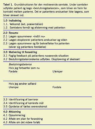 Den motiverende samtale er en form for samtale, som oprindeligt er udviklet af Miller & Rollnik [3] til arbejdet med alkoholikere og stofmisbrugere. Modellen er videreudviklet af Botelho [4] og anvendes meget i arbejdet med patienter, hos hvem livsstilsforandring er påkrævet, for eksempel ved nydiagnosticeret type 2-diabetes. Motivationssamtalen er almindelig rådgivningssamtale overlegen, hvilket er påvist i flere undersøgelser og opsummeret i to metaanalyser [5, 6].