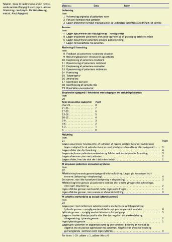 Til undervisningen og træningen udviklede vi en grundstruktur for den motiverende samtale Tabel 1 . Centralt i den er anvendelsen af et beslutningsbalanceskema. Der blev udviklet et videomateriale, som illustrerer alle dele af grundstrukturen, og hvor læge og patient blev fremstillet af skuespillere. De blev instrueret af en erfaren læge for at opnå autenticitet i situationerne. Indholdet i materialet var livsstilsforandring ved nylig opdaget type 2-diabetes.