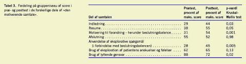 En test af intra rater reliability gav en kappaværdi på 0,74. Gr uppens forandring af adfærd er gengivet i Tabel 3 som procent af maksimumscorer. Som det fremgår af figuren, scorer gruppen højst i samtalens indledning, i at resumere forløbet indtil nu, og i anvendelsen af beslutningsbalancen. Deltagerne anvender efter træning flere eksplorative spørgsmål i forbindelse med udfyldelsen af beslutningsbalanceskemaet, men noget færre lyttende gensvar. Der er ingen forandring i brug af eksploration af patientens anskuelser og følelser og heller ikke i måden at afslutte samtalen på.