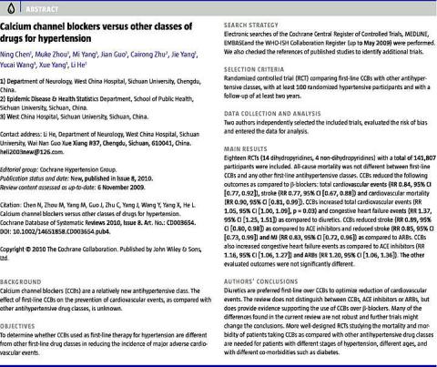 Cochraneanalysen omfatter data fra 18 undersøgelser, i alt 14.000 patienter. Calciumkanalblokkerne (CCB) var betablokkerne overlegne mht. reduktion i apopleksi. CCB fandtes at være ringere end diuretika mht. reduktion af hjertesvigt. Et diskutabelt fund, da hjertesvigt ofte ikke er præcist adjudikeret. CCB fandtes at være angiotensinkonverterende enzym-hæmmere og angiotensin-receptor-blokkere overlegne vedr. apopleksireduktion, hvilket kan forklares ved forskelle i behandlingsblodtryk. Vi finder ikke, at analysens entydige anbefaling af et diuretikum som førstevalgspræparat frem for calciumblokker er retfærdiggjort.