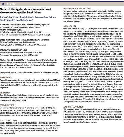 <li><p>Fisher SA, Brunskill SJ, Doree C et al. Stem cell therapy for chronic ischaemic <br>heart disease and congestive heart failure. Cochrane Database Syst Rev 2014;<br>4:CD007888.</p></li>