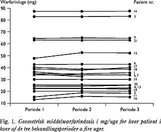 Tolv patienter fik samme warfarindosis i hele undersøgelsesperioden (Fig. 1 ). De resterende ni patienter fik dosis reduceret med 3-15% ved otte kontroller og øget med 5-17% ved tolv kontroller. Den geometriske warfarinmiddeldosis var stabil i de tre behandlingsperioder (Tabel 1 ). Der blev undersøgt for komplians vedrørende CoQ10 ved slutningen af hver behandlingsperiode ved at måle serumkoncentrationen af CoQ10 . Serumkoncentrationen steg med behandling med CoQ10 med en faktor to hos alle patienter i perioden. Middelserumkoncentrationen ± SD var 2,2 μ g/ml ± 0,9 under behandling med CoQ10 , 1,0 μ g/ml ± 0,3 under behandling med Ginkgo biloba og 1,1 μ g/ml ± 0,3 under behandling med placebo. Rutinelaboratorieundersøgelser og kliniske variable varierede ikke signifikant under studieperioden.