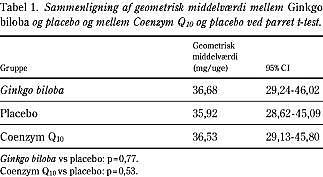 tre behandlingsperioder. Den geometriske middeldosis af warfarin ændredes ikke under de tre behandlingsperioder: Ginkgo biloba 36,7 mg/uge (95% sikkerhedsgrænse: 29,2-46,0); CoQ 10 36,5 mg/uge (95% sikkerhedsgrænse: 29,1-45,8); placebo 36,0 mg/uge (95% sikkerhedsgrænse: 28,6-45,1).