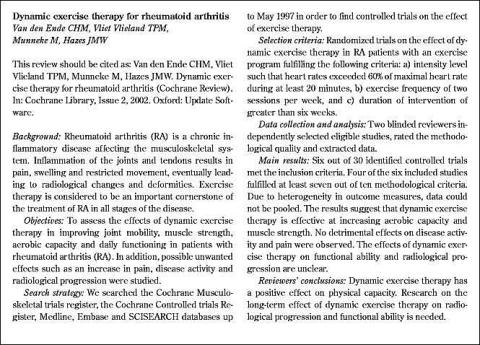 <li>Van den Ende CHM, Vliet Vlieland TPM, Munneke M, Hazes JMW. Dynamic exercise therapy for rheumatoid arthritis (Cochrane review). I: The Chochrane Library, Issue 4, 2000. Oxford: Update Software</li>