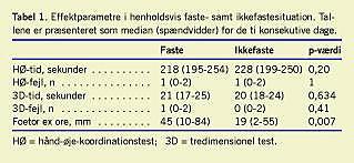 Forsøgspersonens var en 35 årig mand. Forsøgsdata er præsenteret i Tabel 1 , hvor det kan ses, at der ikke var nogen signifikant forskel i hånd-øje-koordinationen, hvad angår tid og fejl, og ej heller ved den tredimensionelle test, hvad angår tid og fejl. Derimod var der en signifikant forskel i foetor ex ore, idet medianværdien var på 45 mm (spændvidde 10-84 mm) under fastesituationen sammenlignet med ikkefaste (19 mm (2-55 mm)) (p = 0,007).