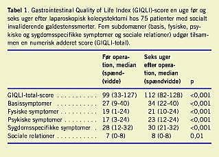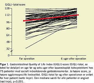 Resultater: Femoghalvfjerds konsekutive patienter (heraf 62 kvinder) fik foretaget ukompliceret laparoskopisk kolecystektomi, og alle sendte besvarede præ- og postoperative spørgeskemaer tilbage. Medianalderen var 42 år (spændvidde 18-69), body mass index (BMI) var 26 (spændvidde 19-39) og den mediane operationstid var 56 minutter (spændvidde 24-130). GIQLI-total var mediant 99 (spændvidde 33-127) før operationen og 112 (spændvidde 82-128) efter operationen (p < 0,001).