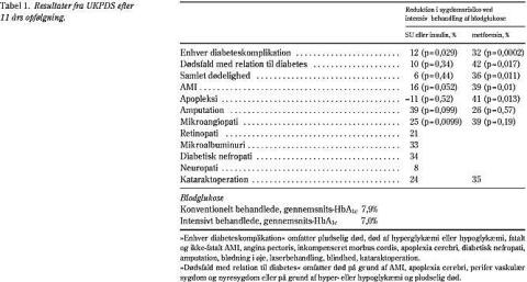 Overvægtige patienter behandlet med metformin opnåede (5) en signifikant 30% reduktion i alle kardiovaskulære (makroangiopatiske) hændelser og død sammenlignet med den konventionelle gruppe (Tabel 1). Med SU og insulin var effekten på disse endpoints betydelig mindre (Tabel 1). Metformin, SU og insulin havde samme effekt på glykæmisk kontrol og mikroangiopati. Vægtstigningen var mindst med metformin. De intensivt behandlede øgede vægten med 2-3 kg i forhold til de konventionelt behandlede og havde flere hypoglykæmitilfælde, i.e. en årlig incidens på 2,6% med insulin, 1,4% med SU, dog kun 0,6% med metformin.