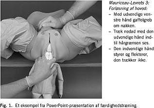For hvert af emnerne blev der i plenum gennemgået en PowerPoint-præsentation illustreret med foto af håndgrebenes elementer vist detaljeret på et fødefantom og en enkel tekst (Fig. 1 ). For hvert emne var der udarbejdet et kompe-tencetræningsskema med kolonnerne: 1) Mål for klinisk færdighed, 2) Håndgreb, 3) Nødvendig viden, 4) Baggrundsviden (med referencer), 5) Sikkerhed/risiko og 6) Evaluering af opnået færdi ghed. Derefter blev kursisterne fordelt i grupper på 3-5 personer og roterede mellem workstations af en halv times varighed. Træningen havde overvejende karakter af fantomtræning i enkeltfærdighederne, for håndtering af postpartumblødning indgik der dog enkelte elementer af teamtræning.