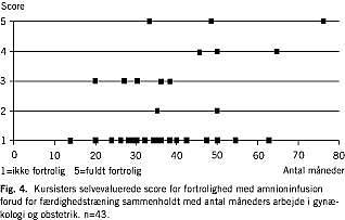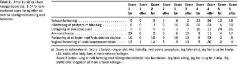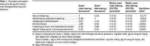 Diskussion: Ved færdighederne forløsning af et foster med fastsiddende skuldre og vaginal forløsning af UK scorede kursisterne lavt forud for træning, og det var i ringe omfang relateret til det antal måneder, kursisten havde arbejdet i specialet. Sandsynligvis fordi disse færdigheder kun kan læres ved fantomtræning. Ved vakuumforløsning, udtagning af skalpblodprøve og til dels håndtering af postpartumblødning scorede kursisterne højere forud for træning, og det ser ud til at blive indlært med tiden, idet scoren steg med antal måneders arbejde i specialet. Ved amnioninfusion scorede kursisterne meget lavt inden træningen, og det blev vurderet som udtryk for manglende implementering. Træning i amnioninfusion er velegnet til fantomtræning. Anvendeligheden af selvevaluering diskuteres.
