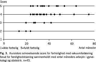 Konklusion er, at undersøgelsen viser et behov for systematisk obstetrisk færdighedstræning. Resultaterne antyder, hvilke færdigheder der kan trænes i hhv. introduktionsuddannelsen og hoveduddannelsen. I målbeskrivels erne i gynækologi og obstetrik [11] er f.eks. planlagt, at kompetencen »stille indikationen for og anlægge vakuumekstraktion« skal læres ved fantomtræning og i klinisk praksis på introduktionslægeniveau. Det underbygges af de foreliggende data. Undersøgelsen kan dog ikke vise, om færdigheder lært på fantomer kan overføres til klinisk praksis. Her vil objektiv test i klinisk praksis være nødvendig.
