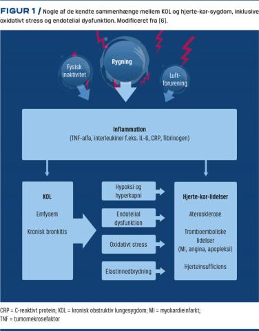 Hjerte-kar-sygdom er en betydende og hyppigt forekommende komorbiditet hos patienter med KOL [5]. Sygdommene deler risikofaktorer og har flere patologiske ligheder bl.a. en høj prævalens af metabolisk syndrom og systemisk inflammation (Figur 1) [6].