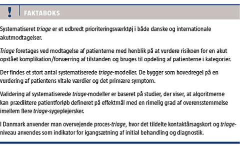 ingen dokumentation for, at systematiseret triage med hensyn til kliniske endepunkter er overlegent i forhold til tidligere praksis. For at sikre den bedst mulige organisering og prioritering af patientforløb i danske såvel som internationale akutmodtagelser er der behov for yderligere studier af systematiserede triage-modeller.