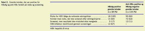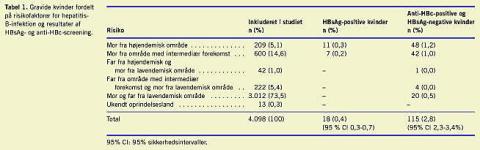 Af de 4.098 kvinder var i alt 115 (2,8%, 95% CI 2,3-3,4%) anti-HBc-positive (og HBsAg-negative) som tegn på tidligere HBV-infektion. Femoghalvfems af de 115 (83%) var ifølge Sundhedsstyrelsens retningslinjer i risiko for at få HBV- infektion, idet 90 af kvinderne var fra områder med øget forekomst af HBV-infektion, og fem af kvinderne havde en partner fra et sådant område . Blandt de 115 kvinder var 37% ikke screenet via egen læge. For 19 (17%) af kvinderne med positiv anti-HBc blev der ikke fundet nogen umiddelbar risikofaktor for HBV-infektion.