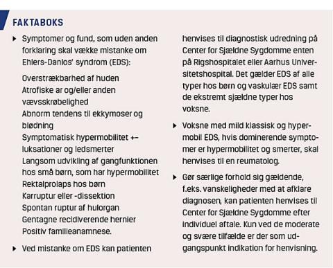Ehlers-Danlos’ syndrom (EDS) omfatter en heterogen gruppe af arvelige bindevævssygdomme, som er karakteriseret ved skrøbeligt bindevæv. De kliniske manifestationer involverer primært hud, led, blodkar og indre organer [1]. Det kliniske spektrum varierer fra milde hud- og ledsymptomer til svære fysiske handikap, livstruende komplikationer og pludselig død [2]. Den samlede prævalens skønnes at være 1:5.000 nyfødte, bl.a. baseret på tal fra England [3].