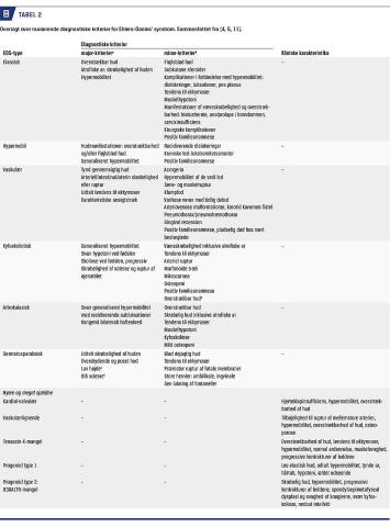 Differentialdiagnostistiske overvejelser (Tabel 3) og klassificering af EDS er vigtig (Tabel 2). Diagnostiske major- og minorkriterier er defineret, men der mangler konsensus om antallet af kriterier, der skal være opfyldt, før en diagnose kan stilles [4], og hvordan der skal undersøges for kriterierne. Den kliniske undersøgelse bør standardiseres således, at der bl.a. er klare retningslinjer for undersøgelse af karakteristiske hudmanifestationer.