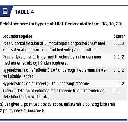 Det anbefales at teste overstrækbarheden af huden på et sted uden ar eller underliggende led [10], og midten af volarsiden på den ikkedominante underarm er foreslået [17]. Der findes ingen konsensuskriterier om den øvre grænseværdi for normal strækbarhed af huden. Den anbefales at være 3 cm [17]. Kvantitative parakliniske metoder er foreslået, men endnu ikke implementeret i klinikken [17]. Mængde og lokalisation af atrofiske ar og blå mærker bør beskrives. Leddene undersøges for hypermobilitet ved brug af den (semi)kvantitative Beightonscore [18] (Tabel 4), hvor en score på ≥ 5 indikerer generaliseret hypermobilitet [7]. Da der ikke eksisterer konsensus om selve undersøgelsesmetoden, foreslås den fremgangsmåde, som er angivet i Tabel 4 [19].