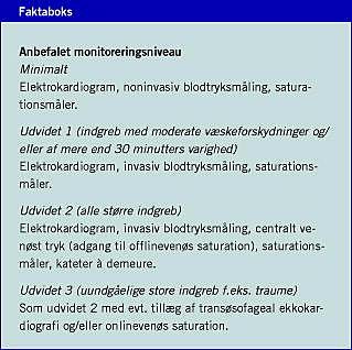 Perioperativ monitorering er ikke ligetil. Almindelige pulsoximetre giver usikre oplysninger ved saturation under 80%. Som et minimum skal patienterne monitoreres med saturation, blodtryk og hjerterytme. Yderligere monitorering afhænger af indgrebets art og varighed (se Faktaboks).