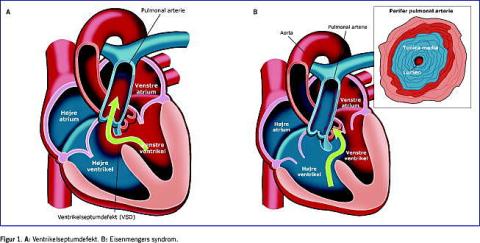 Ved betydende central venstre-højre-shunt pga. medfødt hjertefejl som f.eks. ventrikelseptumdefekt (VSD) (Figur 1A), atrieseptumdefekt (ASD), atrieventrikelseptumdefekt (AVSD), persisterende ductus arteriosus (PDA), aorto-pulmonalt vindue, truncus arteriosus eller univentrikulært hjerte udsættes lungekarrene for øget blodgennemstrømning (longitudinal stress) og oftest et øget tryk (circumferential stress). Dette kan resultere i pulmonal vaskulær sygdom. De initiale morfologiske forandringer omfatter media hypertrofi af pulmonale arterioler, intima proliferation og fibrose, samt okklusion af kapillærer og små arterioler [4]. Forandringerne i lungekarrene er reversible ved tidlig lukning af shunten, men efter 6-12 måneder kan man se irreversible skader i pulmonalkargebetet og permanent øget pulmonal vaskulær resistens (PVR). I tillæg til patoanatomiske forandringer ses desuden øget pulmonal vasokonstriktion pga. endoteldysfunktion med lavt indhold af endogene vasodilatatorer såsom nitrogenoxid (NO) og prostacyclin, samt højt indhold af vasokonstriktorer som thromboxan A2 og endothelin [5]. Når PVR overstiger den systemiske vaskulære resistens (SVR) bliver shunten bidirektionel eller højre-venstre med central cyanose, hvilket er definitionen på Eisenmengers syndrom [4] (Figur 1B).
