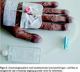 Dehydrering nedsætter hjertets preload , mindsker den pulmonale gennemblødning og øger samtidig risikoen for tromber hos patienter med høj hæmatokritværdi. Patienterne skal derfor informeres om ekstra væskeindtag ved febrilia, og der skal gives intravenøst væsketilskud, såfremt patienterne faster forud for undersøgelser og behandling. Pga. risikoen for paradokse luftembolier skal der altid anvendes luftfilter ved intravenøse infusioner og injektioner (Figur 2).